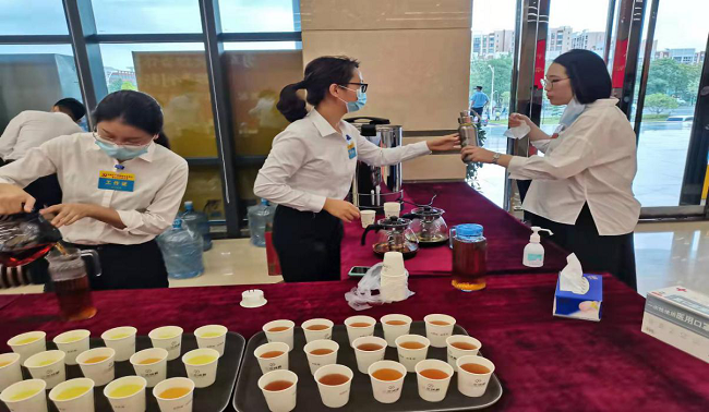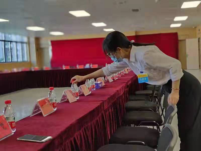 三是細化會場服務。會前反復檢查會場桌椅、臺卡等,確保按要求、按標準擺放;全面排查高低壓配電設備,認真調試音響、話筒、燈光等設備,保障會議正常有序進行。會議中,認真做好會場引導、會務咨詢、茶水服務及更換幕簾等工作,根據議程需要3分鐘內完成會場桌椅轉移,我司現場會務服務人員僅用1分鐘完成工作,并積極完成各項臨時應急任務。