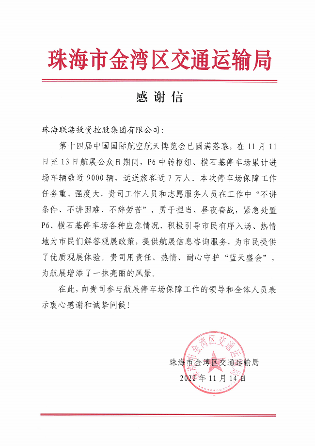 珠海市金灣區(qū)交通運(yùn)輸局向聯(lián)港集團(tuán)參與航展停車場(chǎng)保障工作的領(lǐng)導(dǎo)和全體人員表示衷心感謝和誠(chéng)摯問(wèn)候!